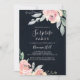 Diese elegante Party Einladung mit rosafarbenen Blumen ist perfekt geeignet für einen modernen Geburtstag, einen Ruhestand oder ein überraschendes Party. Das Design besteht aus handgezeichnet, rosa, blüten Rose und Pfannkuchen mit grünen und grauen Blätter im dunkelblauen Hintergrund und inspiriere die natürliche Schönheit.