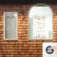 Beginnen Sie Ihre Hochzeitsgäste mit diesem eleganten Blumenfenster, das mit schönen rosa Rosen und Pfannkuchen dekoriert ist. Ein schönes Schild für eine Hochzeitsfeier im Frühjahr oder Sommer, die in einem schicken antiken Goldskript geschrieben ist.