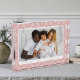 Mit diesem eleganten, rosafarbenen, nordischen Snowflake Muster Weihnachtsbaum präsentieren Sie Ihre Erinnerungen. Ihr horizontales Foto ist gerahmt in Weiß und Set vor einem rosa-weißen nordischen Schneeflockenhintergrund. Personalisieren Sie mit Ihrem festlichen Gruß und Familiennamen bei der Koordinierung der rosa Schrift. Ein stilvoller saisonaler Sake, der ein wunderbares Urlaubsgeschenk für Freunde und Familie macht.