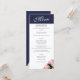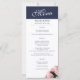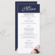 Elegantes rosa Rose Bouquet Blumenmenü. Dieses moderne Blumenmenü bietet schöne rosa Rosen. Der Hintergrund ist weiß und dunkel mariniert Mitternachtsblau. Der Text ist in einem modernen Skript. Sie können den gesamten Text ganz einfach anpassen - personalisieren Sie ihn mit dem Namen der Braut und des Bräutigams, dem Hochzeitstag und Ihrem Hochzeitsmenü. Die Rückseite ist dunkelblau mit einer Rose.