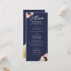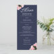 Elegantes rosa Rose Bouquet Blumenmenü. Dieses moderne Blumenmenü mit einem schönen rosa Rosenbukett. Der Hintergrund ist dunkel mariniert Mitternachtsblau. Der Text ist in einem weißen, modernen Skript. Sie können den gesamten Text ganz einfach anpassen - personalisieren Sie ihn mit dem Namen der Braut und des Bräutigams, dem Hochzeitstag und Ihrem Hochzeitsmenü. Die Rückseite ist dunkelblau.