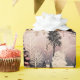 Ein zartes rosa und schwarzes Muster mit schneebedeckten Hügeln und ätherischen Gebäude zwischen eleganten Pink- und Schwarzkiefern.