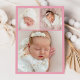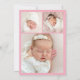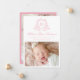 Mit dieser eleganten, weich rosa Foto-Geburtskarte kündigen Sie die Ankunft Ihres Babys an. Die Vorderseite zeigt das Monogramm Ihres Babys, das durch ein zartes blumenfarbenes Wappen in sanftem Rosa auf weißem Hintergrund gerahmt ist. Der vollständige Name Ihres kleinen Kindes erscheint in anmutiger Kalligraphie, mit Platz für Geburtsdaten, Familienname und einem horizontalen Foto für Neugeborene. Auf der Rückseite befindet sich eine koordinierende 3-Foto-Collage, die sich ideal eignet, um noch mehr besondere Momente zu teilen. Personalisieren Sie die Details und Fotos Ihres Babys, um einen schönen Sake für Familie und Freunde zu schaffen.