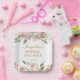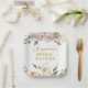 Die eleganten Teller aus geblümten Brautpartys mit rosa Rosen und Pfannkuchen sind mit hübschen, rosa Rosen dekoriert. Eine hübsche Dekoration für eine Hochzeitsfeier im Frühling oder Sommer, die in einem schicken antiken Goldskript geschrieben ist.