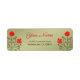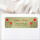 Ein kundenspezifisches Rücksendeadresse- oder Backlabel mit Schrift- und Blockbriefen und barocken Blätter in Rot und Gold, auf einem Imitat goldenem Hintergrund.