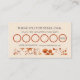 Belohnen Sie Ihre treuen Kunden mit unserer eleganten Rustic Brown Fall Floral Pattern Loyalty Card. Diese wunderschön gestaltete Karte besticht durch einen rustikal-braunen Hintergrund, der durch zarte Herbstfloralen hervorgehoben wird und Wärme und Eleganz kombiniert, um einen unvergesslichen Eindruck zu erwecken. Das raffinierte Design spiegelt den Charme der Herbstsaison wider und bietet gleichzeitig ein gepflegtes, berufliches Aussehen für Ihr Geschäft. Ideal für Salons, Boutiquen, Cafés oder Firmen, die sich Kundenbindung aufbauen möchten. Mit seiner raffinierten Ästhetik ist es mehr als nur eine Treuekarte - es ist ein stilvolles Zeichen der Wertschätzung für Ihre geschätzten Kunden.