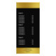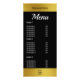 Front: Im oberen Teil dieser eleganten Rack-Karte befindet sich der schwarze Beistelltext für den Restaurantnamen auf einem goldenen Streifen in den Imitaten. Unten steht der weiße Text als 'Menü'. Unter Menü gibt es weißen Text für Ihre Menüeinträge und Preise. Der goldene Streifen am unteren Rand des Imitats hat ein Display für Ihr Logo. Zurück: Für Menüeinträge und Preise gibt es zusätzlich weißen Text. Im unteren Bereich des Imitats hat der goldene Streifen schwarzen Bildschirmtext für Ihre Restaurantadresse und Telefonnummer. Alle Texte können bearbeitet oder gelöscht werden. Gold ist ein künstlerisches Rendering (nicht Folie).