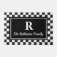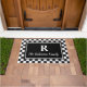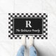 Elegantes, individuelles Monogramm Doormat in klassisch karierten schwarz-weißen Farbmustern . Sie können mit dem Nachnamen Ihrer Familie im Skript und einem Serifenstil-Monogramm-Initial personalisieren.
