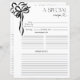 Eine hübsch gestaltete Rezeptionskarte für Brautpartys, die den Gästen die beliebtesten Geschirr mit der zukünftigen Braut teilt. Egal, ob es sich um einen Familienkklassiker, einen Cocktail oder einen trendigen Favoriten handelt, diese Karte bietet einen stilvollen Raum, um Zutaten, Richtungen und persönliche Noten aufzuzeichnen. Das elegante schwarze Band-Motiv erinnert an die Sentimentalität "den Knoten zu binden" und bewahrt dabei eine frische, raffinierte Ästhetik. Ideal für den Austausch von Rezepten, Brautparty zum Kochen oder als charmante Ergänzung zu einem Kochbuch, lädt diese Karte die Gäste ein, an den künftigen Küchenabenteuern der Braut teilzunehmen. Für die Koordination von Entwürfen wie z.B. Rezeptorbindern, Beschilderungen und Duscheinladungen wenden Sie sich bitte an den Designer, um sich nach den gewünschten Variationen zu erkundigen. Copyright Anastasia Surridge, alle Rechte vorbehalten.