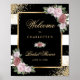 Elegantes, schwarz-goldfarbenes Begrüßungsschild mit blauen, rosa Blume und Grün, das die Details der Veranstaltung in einem goldfarbenen Rahmen mit goldenen Konfetti auf schwarz-weiß gestreiften Hintergrund umrahmt. Matching-Elemente verfügbar.