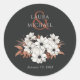 Diese eleganten 3" x 3" klassischen runden Hochzeitsaufkleber sind mit einem schönen Blumendesign in Schwarz, Rost und Elfenbein auf schwarzem Hintergrund mit Platzhaltern für die Brautpaar-Vornamen und das Hochzeitsdatum ausgestattet.