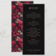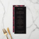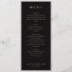 Dieses elegante Hochzeitsmenü verfügt über ein klassisches, vertikales Layout mit einem anspruchsvollen schwarzen Hintergrund und knapper weißer Schrift. Das Design verwendet eine saubere Serifenschrift, um eine formelle und verfeinerte Atmosphäre zu schaffen, wobei die Abschnitte für Vorspeisen, Salat, Hauptgericht und Dessert klar gekennzeichnet sind. Jedes Gericht wird in einem leicht lesbaren Format präsentiert, was das allgemeine Gefühl von Luxus und Einfachheit unterstreicht. Perfekt für eine formelle Veranstaltung strahlt dieses Menü Eleganz und Raffinesse aus und ist somit ideal für Paare, die eine zeitlose und stilvolle Präsentation für ihren besonderen Tag suchen.