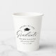 Elegante Abschluss-Papiertassen mit einer Graduationskappe mit der Phrase "Cheers to the Graduate" in einem schwarzen Kalligrafieschrift auf weißem Hintergrund. Personalisieren Sie die modernen Papiertassen des Abschlusses mit dem Namen, dem Namen der Schule und dem Abschluss Jahr. Das Design wiederholt sich auf der Rückseite. Die einfachen Abschluss-Cups sind ideal für Ihr High School- oder Uni-Abschluss-Party.