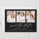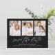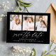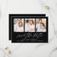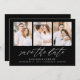 Verkünden Sie Ihre bevorstehenden Nuptials stilvoll mit unserer Save the Date Karte für elegantes Script-Foto. Das elegante Speichern der Datumskarten zeigt 3 Ihrer Lieblings-Verlobung-Fotos mit "Save the Date" in einem weißen, modernen Kalligrafieschrift vor schwarzem Hintergrund. Personalisieren Sie die Karte, indem Sie Ihre Namen, das Hochzeitstermin und den Hochzeitsort hinzufügen. Die minimalistische Save the Date Karte kehrt zu einem soliden schwarzen Hintergrund oder einer Farbe Ihrer Wahl zurück.