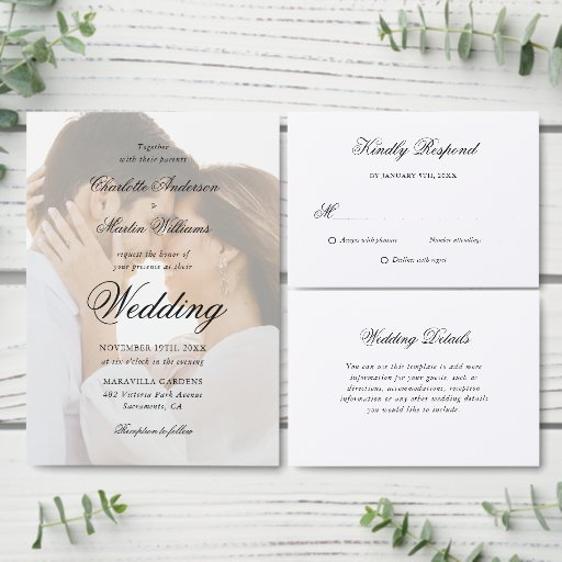 Elegante RSVP-Hochzeitskarten mit elegantem Script-Schriftart. Perfektes Kartendesign, um Ihre formelle Schwarz-Weiß Hochzeitsfeier zu ergänzen. Matching-Elemente verfügbar.