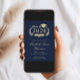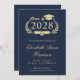 Moderne dunkelblaue Uni-Abschluss-Party Einladung mit "Class of" in einer hellen Goldillustrierung eines Lorbeerkranzes, der einen Graduiertenkopf und Diplom und den Namen des Absolventen in einem eleganten, hellen Goldskript enthält. Fügen Sie ihre Schule, Dur, Ehren oder zukünftige Pläne und die Graduiertenparty Details in einfachen modernen leichten Gold Typografie.