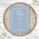 Ein stylischer, staubblauer Deko inspiriert Hochzeitsfeier erspart die Zeiteinladung mit stilvoller Typografie. Entwickelt von Thisisnotme©