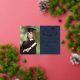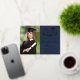 Moderne dunkelblaue Uni-Abschluss-Party Einladung mit echter Goldfolie, "Class of" in einer Illustration von Lorbeerkranz mit Gradkappenoberteil und Diplom, ein Foto des Absolventen und ihren Namen in einem eleganten Drehbuch. Fügen Sie ihre Schule, Hauptfach, Ehren oder künftige Pläne. Auf der Rückseite, fügen Sie die grad Party Details in einfachen leichten Gold Typografie.