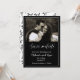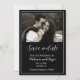 Dieses elegante Script-Foto Save the Date ist perfekt für diejenigen, die den minimalistischen Look bevorzugen. Das Kartendesign bietet Ihr Lieblings-Foto oder formales Verlobung-Foto vor einem schwarzen Hintergrund. Die Wörter Save the Date und die Namen der Braut und der Zelter werden in einer wunderschönen, romantischen Schrift geschrieben. Die Erholung ist in einer weißen Schrift gehalten, die dem minimalistischen Stil entspricht. Aktualisieren Sie die Karte mit Ihren Informationen mithilfe der einfach bereitgestellten Vorlage. Die Rückseite der Karte weist ein elegantes Schwarz-Weiß-Muster auf.
