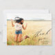 Dieses elegante Abschluss Dankeschön-Karte verfügt über ein volles Foto und eine elegante Kalligraphie. "Danke" ist in hübscher Schrift in der unteren rechten Ecke geschrieben, mit dem Namen des Absolventen und Abschluss Jahr unten. Dieses schwarze Typografie-Design überlagert ein volles Foto des neuen Absolventen (horizontal/landschaftlich orientiert). Der Rücken ist leer und kann zusätzliche Fotos oder eine personalisierte Note für Empfänger aufnehmen.
