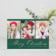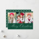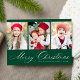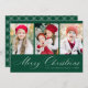 Einfache Weihnachtskarte mit drei senkrechten Fotos und "Frohe Weihnachten" in einem festlichen weißen Kalligrafieschrift auf grünem Hintergrund. Personalisieren Sie die Vorderseite der Multi-Foto Weihnachtskarte mit Ihrem Familiennamen und dem Jahr. Die Karte zeigt ein modernes, grün-weiß kariertes Muster an.