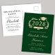 Moderne grüne Uni-Abschluss-Party Einladung Postkarte mit "Class of" in einer goldenen Abbildung eines Lorbeerkranzes mit einem Grad-Oberteil und Diplom und dem Namen des Absolventen in einem eleganten Goldskript. Fügen Sie ihre Schule, Hauptfach, Ehren oder zukünftige Pläne, und die Graduierungsparty Details auf der Rückseite.