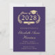 Moderne Party Einladung mit lila Uni-Abschluß mit "Class of" in einer goldenen Illustration eines Lorbeerkranzes, eines Goldene Grades Oberteil und Diplom und dem Namen des Absolventen in einem eleganten Goldskript. Fügen Sie ihre Schule, Dur, Ehren oder künftige Pläne und die Graduierungsparty Details in klassischen Gold Serif Typografie.