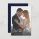 Elegantes Script Navy Blue Foto Minimalistisch Hochzeit speichern Sie die Date Card.