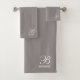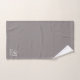 Ein elegantes, mit Monogramm, hellgraues Handtuchhandtuch-Set mit weißem Schriftzeichen-Initial und Serifennachname. Eine vollkommene Akzent-Farbe für ein erdneutrales Wellness-Center-Bad.