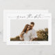 Ein elegantes Skript-Foto Save the Date mit horizontalem Foto und minimalem Text. Klicken Sie auf die Schaltfläche Personalisieren, um dieses Design anzupassen.