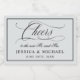 Toast der Braut und Bräutigam mit Schaumwein mit personalisierten Etiketten mit ihren Namen und Hochzeitsdatum. Dieses Design hat einen schönen Kalligraphieskripttext, der das Wort Cheers beschreibt, sowie einen zusätzlichen Text, der die Namen der Braut und des Bräutigams und das Hochzeitstag zeigt. Die hier gezeigte Hintergrundfarbe ist silbergrau und kann auf Wunsch auch auf andere Farben angepasst werden.