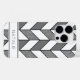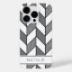 Das personalisierte iPhone Gehäuse zeichnet sich durch ein elegantes Zickzack Design mit einem geometrischen Herringbone-Muster in Grau, Weiß und Imitat silber Glitzer mit schwarzen Linien aus.