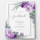 Hier ist eine atemberaubende Möglichkeit, um Ihre Gäste zu empfangen, um Ihre Hochzeit Gästebuch zu unterschreiben. Dieses Design besticht durch wunderschöne Pfannkuchen und Rose in lila und violetten Farbtönen sowie durch eine trendige Eukalyptus-Blätterpflanze. Ihre leicht personalisierten Hochzeitsdetails sind durch ein Imitat silberne Folie auf einem eleganten, weißen Hintergrund umgeben. Wenn Sie eine Designfrage haben oder dieses Design auf einem anderen Produkt sehen möchten, kontaktieren Sie mich bitte unter jschmidtdesignworks@gmail.com. Design © Judith Schmidt.