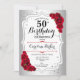 Elegante florale feminine 50. Geburtstagseinladung mit Ihrem Foto auf der Kartenrückseite. Glam-Design mit Imitaten Silber. Enthält rote Rosen, Skript-Schriftart und Konfetti. Ideal für ein stilvolles Party für Erwachsene. Personalisieren Sie Ihre persönlichen Daten. Kann für jedes Alter angepasst werden! Gedruckte Zazzle Einladungen oder Sofortdownload digitalen druckbaren Vorlage.