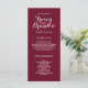Elegante Hochzeitsprogramme. Weißer Text auf bordeauxfarbenem Hintergrund. Design von Elke Clarke © Verfügbar unter www.zazzle.com/monogramgallery. Passen Sie mit Ihrer Hintergrundfarbe und all Ihren persönlichen Informationen ein einfaches und dennoch anspruchsvolles Programm an, das Ihre Saaldiener ausgeben können, wenn Ihre Gäste in die Kirche eintreten oder sich dort befinden, wo die Zeremonie stattfinden wird. Es hilft den Leuten, während der Zeremonie mitzumachen, aber auch als Pfand für Ihre Gäste. Sie können die Vorlagenfelder verwenden, um die vorgeschlagenen Informationen über Ihre Hochzeitsfeier und die Reihenfolge des Dienstes auszufüllen und Ihnen zu danken, oder wählen Sie "Anpassen" und verwenden Sie das Bearbeitungsmenü, um den Textabstand, die Schriftart, die Farben zu ändern, wie Sie Ihre eigenen Hochzeitsprogramme erstellen möchten.