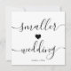 Dies ist eine einfache schwarz-weiße Skript Kleinere Hochzeitsankündigung Karte, um Ihre Gäste zu informieren, dass Sie beschlossen haben, Ihre Hochzeit zu verkleinern, haben eine kleinere Hochzeit, Mikrohochzeit, intime Hochzeit aufgrund bestimmter Umstände.