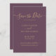 Elegante Skript minimalistisch moderne, nicht Foto burgundy und Gold Hochzeit speichern das Datum Ankündigung Karte. Einfache, saubere Design-Vorlage mit einer eleganten, kursiven Handschrift Schrift Schrift "Save the Date" in Gold auf violett oder staubigen Pflaume lila Hintergrundfarbe. Diese klassische Karte ist ideal für Paare, die ein traditionelles Save the Date mit einer modernen Touch will, ohne Foto. Wenn Sie Hilfe oder passende Artikel benötigen, wenden Sie sich bitte an den Designer.