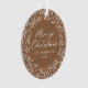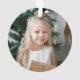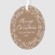 Elegantes Urlaubssornament mit "Frohe Weihnachten" in einem weißen Kalligraphieskript umrahmt von einem Kranz aus Schneeflocken und Kiefernästen auf einem kuscheligen Hintergrund. Personalisieren Sie die Vorderseite des Ornaments, indem Sie Ihren Familiennamen und das Jahr hinzufügen. Im hinteren Teil des Ornaments befindet sich Ihr Lieblings-Foto, das es zum idealen Zuhause für Freunde und Familie macht.