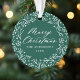 Elegantes Urlaubssornament mit "Frohe Weihnachten" in einer weißen Kalligraphie-Schrift umrahmt von einem Kranz von Schneeflocken und Kiefernästen auf grünem Hintergrund. Personalisieren Sie die Vorderseite des Ornaments, indem Sie Ihren Familiennamen und das Jahr hinzufügen. Im hinteren Teil des Ornaments befindet sich Ihr Lieblings-Foto, das es zum idealen Zuhause für Freunde und Familie macht.