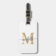 Girly Stylish Moderne elegante White and Gold Monogram Initial Name Script Custom Personalisierte Personalisiert Luggage Bag Tag. Dieses Design mit einem Vornamen in einer hübschen Hand Schwanz-Schriftart-Kalligraphie (oder Typografie) mit Monogramm-Initial, Adresse-Info in Gold und Schwarz auf weißem Hintergrund. Diese sind einfach zu anpassen. Stilvolles Frauengeschenk für Hochzeit, Brautparty, 16 Geburtstag, Brautparty, Abschluss und für alle, die Lieben glamourösen Stil.