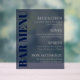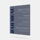 Akryllische Hochzeitsbar-Menüschild mit grau und marineblau Typografie auf einem transparenten dunkelblauen Hintergrund gedruckt. Dunkeles transparentes Strichmenü-Schild auf Acryl mit transparentem dunkelblauen Hintergrund, Strichmenü auf der Seite in marineblau geschrieben, und das Menü selbst in eleganten grauen Schriften.