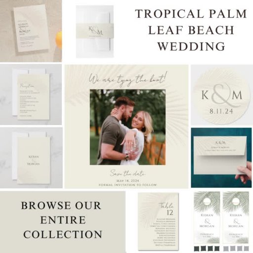 Melden Sie sich Ihre Verlobung an und schicken Sie eine Save the Date mit dieser einzigartigen Karte des tropischen Strandplatzes. Das minimale tropische Palmenblatt-Design ist leicht zu personalisieren.Das Vintage Palmenblatt kombiniert mit einer schönen Schriftart-Paarung schafft einen einzigartigen und raffinierten Look, der perfekt für Ihren besonderen Tag ist. Fügen Sie Ihr quadratisches Foto hinzu und passen Sie den Text an. Vergewissern Sie sich, dass Sie andere Produkte in unserer Hochzeitssuite Karo machen.