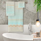 Ein schönes Set mit gestreiftem Badetuch in sanften türkisfarbenen und sandfarbenen Strandfarben. Wunderschön für ein Strandhaus oder einen küstennahen Wohnbereich sowie ein pastellfarbenes Designbadezimmer.