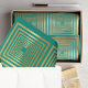 Dekoratives, elegantes und glamouröses türkisfarbenes und goldenes Gewebpapier mit glänzenden goldenen Quadraten, die eng mit der 3D-Illusion verbunden sind.