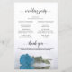 Diese Hochzeitsprogramme sind elegant und geschmackvoll, aber dennoch preisgünstig. Die Einrichtung besteht aus einem Single, der lang gesteppt und blau, türkisblau oder azurblau ist und in einem Wasserbecken mit Wellen und Wellen reflektiert wird. Die Typografie zeigt eine laky schwarze Schriftzeichen-Kalligraphie, und es gibt Raum für Details über die Zeremonie, das Brautparty, und ein kurzes Dankeschön.