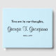 Dieses traurige Bestattungs- oder Denkmäler-Gästebuch enthält die Meldung "Du bist in unseren Gedanken", zusammen mit einem individuellen Namen und Geburtsdaten/Todesdaten. Es könnte verwendet werden, um die Erinnerungen von jemandem aufzuzeichnen, der vor kurzem verstorben ist.