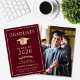 Elegante bordeauxrote Uni-Abschluss-Ankündigung mit einem goldenen Gradmütze und schlichter, moderner Typografie für den Namen, das Jahrgang, die Uni oder die Universität, den Abschluss und die Hauptfach- oder Ehrensymbole. Das Foto des Absolventen füllt die Rückseite der Karte aus.
