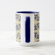 Elegante Vintage Damassohne Blaugelbe Monogramm Tasse. Schönes nahtloses Muster Blau auf weißem Hintergrund.Die Toilabdrücke sind ein Allzeit-Wut im Moment, ein elegantes und verziertes Vintages Toile de Jouy mit exotischen Damast-Mustern, einem lustigen Stil, der derzeit für Wohngestaltung, Kleidung, Handy und IPad Hüllen, Einladungen und vieles mehr anzieht. Das Design ist klassisch und zeitlos mit atemberaubender Farbe. Sie können alle Textfarben und Schriftart ändern, klicken Sie, um weiter unter dem Bereich der Textanpassung, der Sie in das Design-Tool führt, anzupassen. Ein einzigartiges Geschenk für Geburtstag, Urlaub und jeden besondere Anlass. Ob zum Valentinstag, zu Weihnachten oder als Geschenk im Allgemeinen - es ist eine tolle Geschenkidee