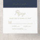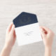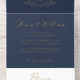 Elegante Hochzeitseinladung in marineblauer Blau, die Ihre Monogramm-Initialen in einem Hochzeitszittel, Ihre Namen, "Empfang zu folgen" und "UAwg" in einem schicken Drehbuch präsentiert, Ihre Einladungsdetails in klassischer Serifentypografie und eine weiße, wegreißende UAWG-Postkarte, alles in Ihrer Wahl von echter Goldfolie, Silber oder Rose. Sie können die Größe des Skripts für längere oder kürzere Namen anpassen, indem Sie auf Wunsch im Entwurfswerkzeug das Format ändern.