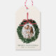 Dress up your holiday gifts mit diesen eleganten Foto-Geschenketiketten, die Ihr Bild umrahmen von einem Aquarellkranz umgeben, der von einem bemalten roten Bogen und Band aufgehängt wird. "Frohe Weihnachten" wird in klassisch dunkelgrüner Serifenschrift auf einem warmen cremefarbenen Hintergrund angezeigt, mit Platz, um Ihren Familiennamen unten hinzuzufügen. Ein raffiniertes und festliches Detail für Weihnachtsgeschenke, Urlaubsvorzüge und saisonale Geschenkverpackung.